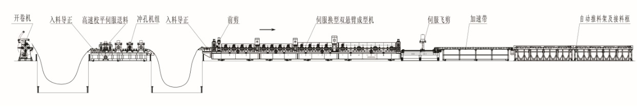 開(kāi)卷機(jī)---入料導(dǎo)正--伺服送料--沖孔機(jī)組---導(dǎo)正---前剪---成型部分---伺服飛剪----加速帶----自動(dòng)碼垛機(jī)