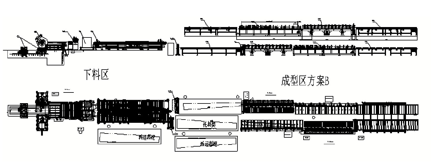 2 該生產線能生產多種板寬、截面、長度的頂板,更換規格時需調整縱橫剪角度、沖缺口模具和切端頭擋料僅需調整相對位置,真空吸盤和翻邊壓料塊需根據板型不同做相應更換,集中沖孔則需要根據板型的不同,調整個別沖孔機,無需全部調整。通過以上操作,便可實現多種板型的生產。