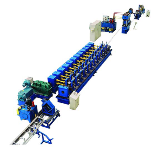 輕軌、地鐵導軌不銹鋼帶冷彎生產線由開卷機、入料導正、校平機、切頭機(對焊)、送料機、沖孔機、壓印機、輥壓成型機、成型剪、出料架、液壓系統、電氣控制系統組成,生產線速度:3-6m/min。